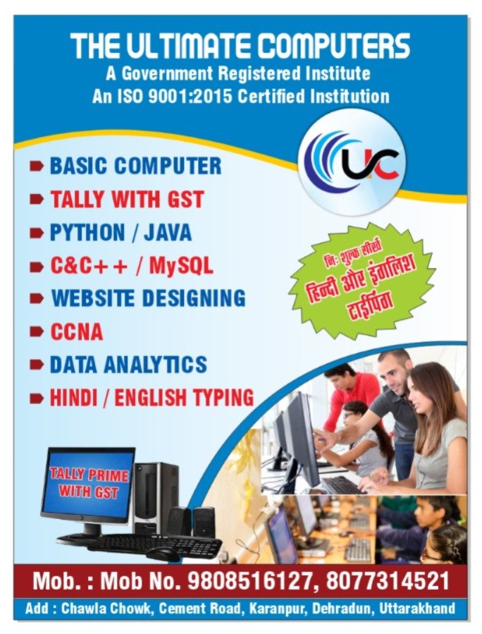 Looking to enhance your computer skills? Look no further than The Ultimate Computers – Institute Of Professional Computer Training in Dehradun, Uttarakhand! As a premier institute specializing in professional computer training, we offer a comprehensive curriculum that caters to all skill levels. 🖥️💪🎓 From basic computer literacy to advanced programming, our experienced instructors will guide you every step of the way. 🌟 Expand your knowledge and boost your career prospects with our cutting-edge courses. Join us today and unlock your full potential! Book your spot now.